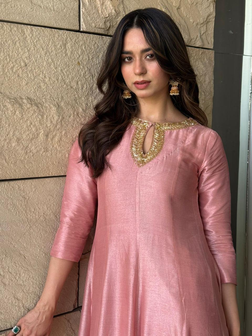 MAUVE PINK 3/4 SLEEVE NECKLINE EMBROIDERED FULL KALI ANARKALI WITH FLORAL BIG BUTTI AND PALAZZO .